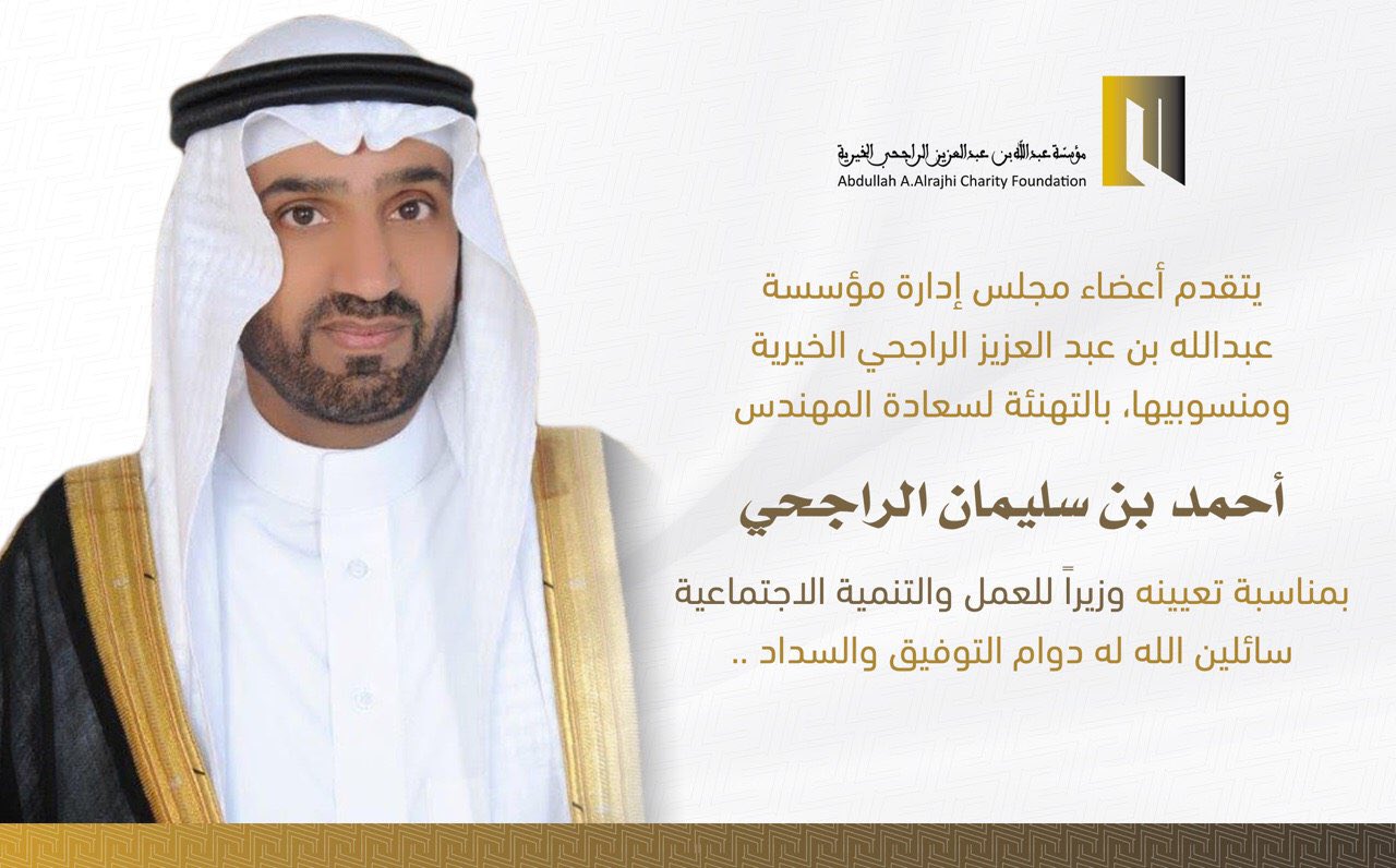 الـ ـراجـ حـ ـي الـ ـخـ ـيـ ـريـ ـة En Twitter الراجحي الخيرية تهنئ سعادة المهندس أحمد بن سليمان الراجحي Ahmed S Alrajhi بمناسبة تعيينه وزيرا للعمل والتنمية الاجتماعية Mlsd Sa سائلين الله له دوام التوفيق