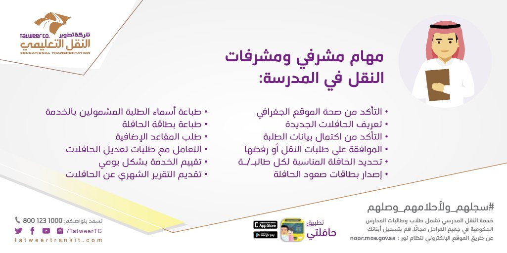 مهام الطالب في منصة مدرستي تاريخ ووقت الإضافة. استمارة موافقة ولي أمر الطالب للاشتراك في النقل المدرسي. الدليل الارشادي للنقل المدرسي في نظام نور 1440 هـ 2019 م للتحميل المباشر المجاني لكل من يرغب في الحصول عليها بصورة مباشرة سهلة. وذكر الشاعر أنه مع بدء العام الدراسي الجديد ارتفع عدد مشرفي ومشرفات السلامة في حافلات النقل المدرسي لدى مواصلات الإمارات إلى أكثر من 4440 مشرفا ومشرفة في حافلات المدارس الحكومية والخاصة.