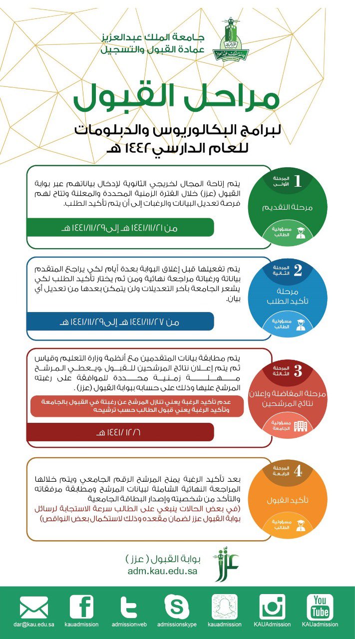 عمادة القبول والتسجيل Kau On Twitter عمادة القبول والتسجيل بـ جامعة الملك عبدالعزيز تعلن المواعيدالزمنية للقبول في الانتظام لبرامج البكالوريوس والدبلومات للعام الدراسي ١٤٤٢هـ Https T Co Zae3atuxli