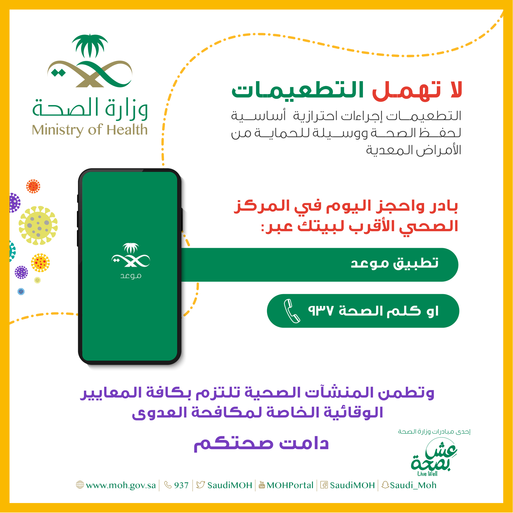 و ز ا ر ة ا لـ صـ حـ ة السعودية On Twitter حفاظ ا على صحة أبنائكم لا تؤجل التطعيمات المراكز الصحية تلتزم بكافة الاحترازات الوقائية لمكافحة العدوى بادر واحجز الآن ودامت