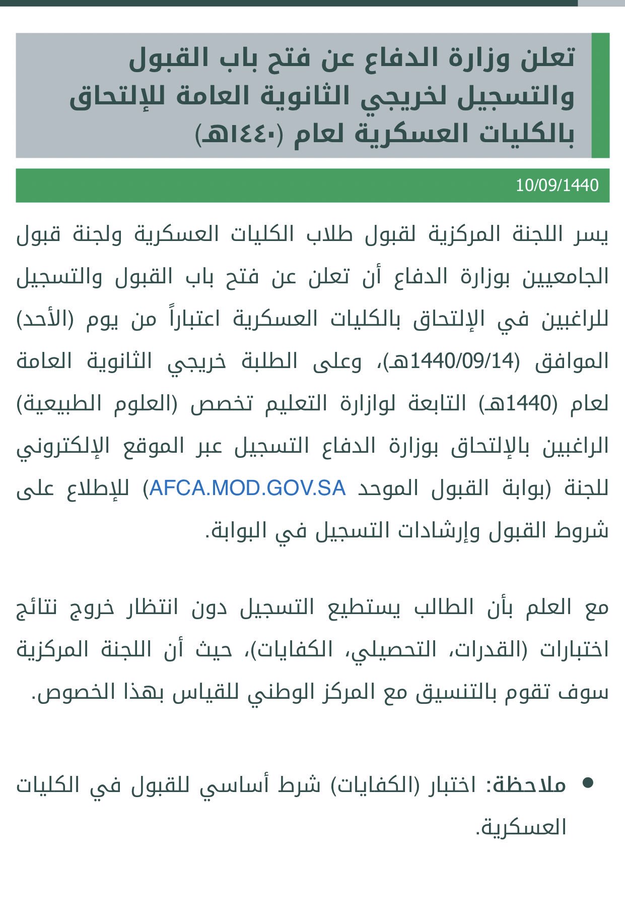 وظايف عسكريه On Twitter وزارة الدفاع تعلن وزارة الدفاع عن فتح باب القبول والتسجيل لخريجي الثانوية العامة للإلتحاق بالكليات العسكرية لعام ١٤٤٠هـ Https T Co Or59ofxwyu Https T Co Iqf8isegqp