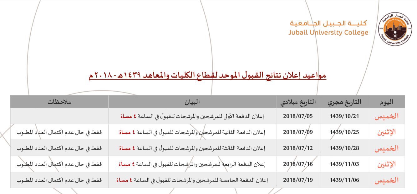 Uzivatel كلية الجبيل الجامعية Na Twitteru تنبيه مهم مواعيد إعلان نتائج القبول الموحد لقطاع الكليات والمعاهد Https T Co T0mqrdhi0q