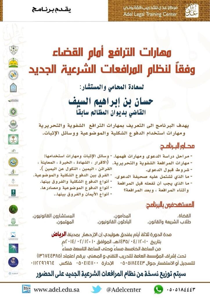 حسان السيف على تويتر Adelcenter دورة مهارات الترافع أمام القضاء وفقا لنظام المرافعات الشرعية الجديد للمحامي حسان السيف Http T Co 4kvsey0un0
